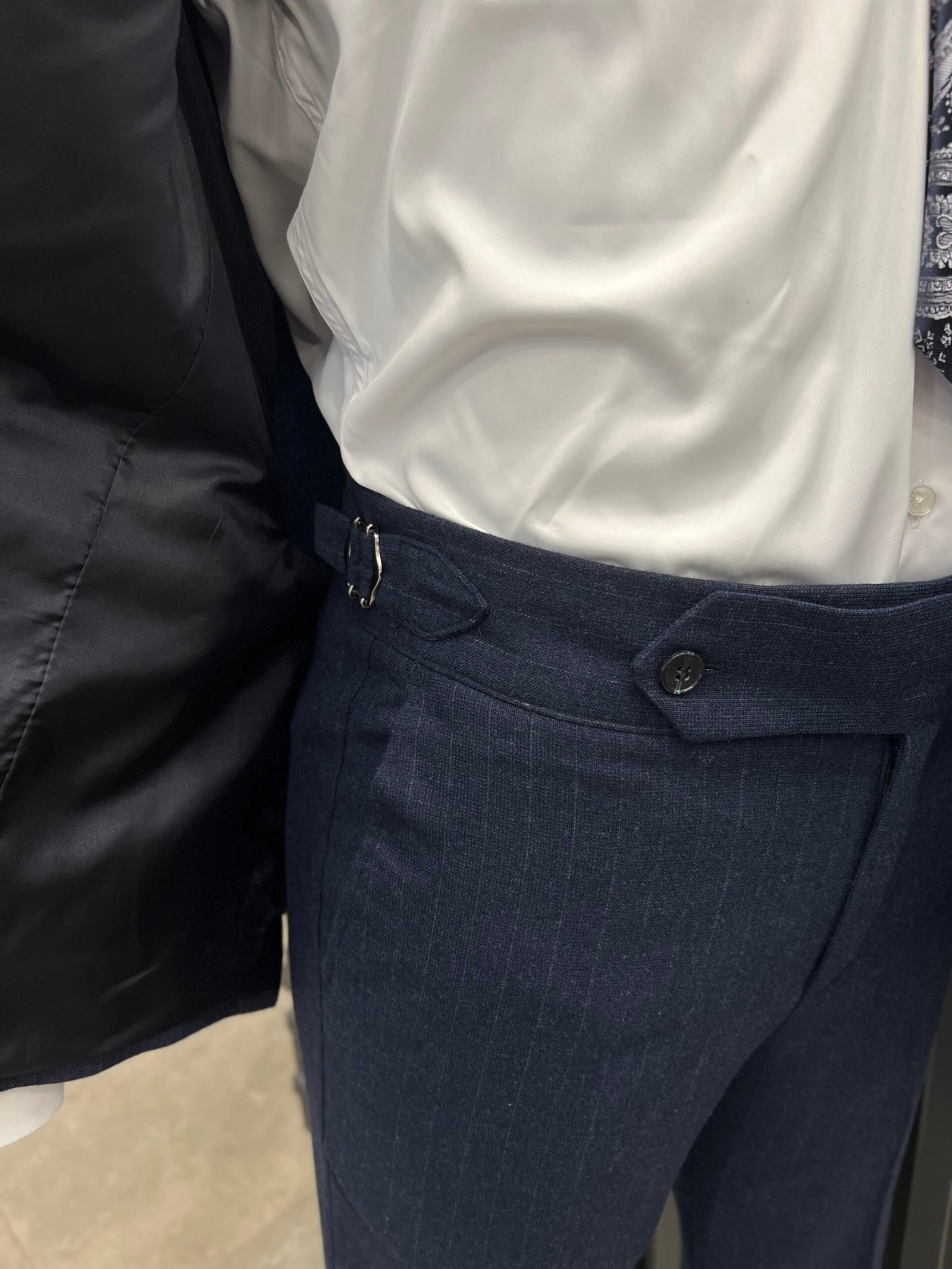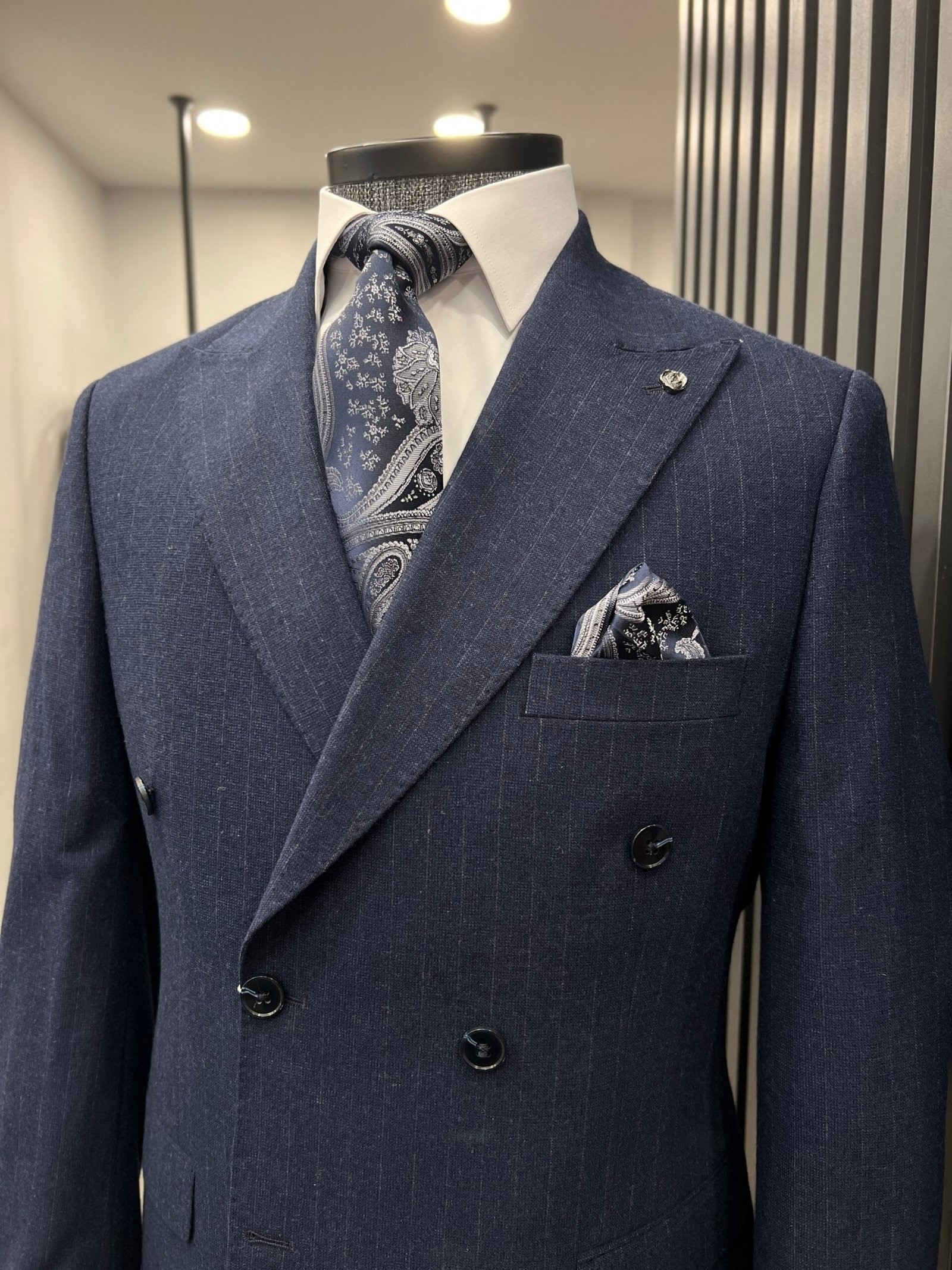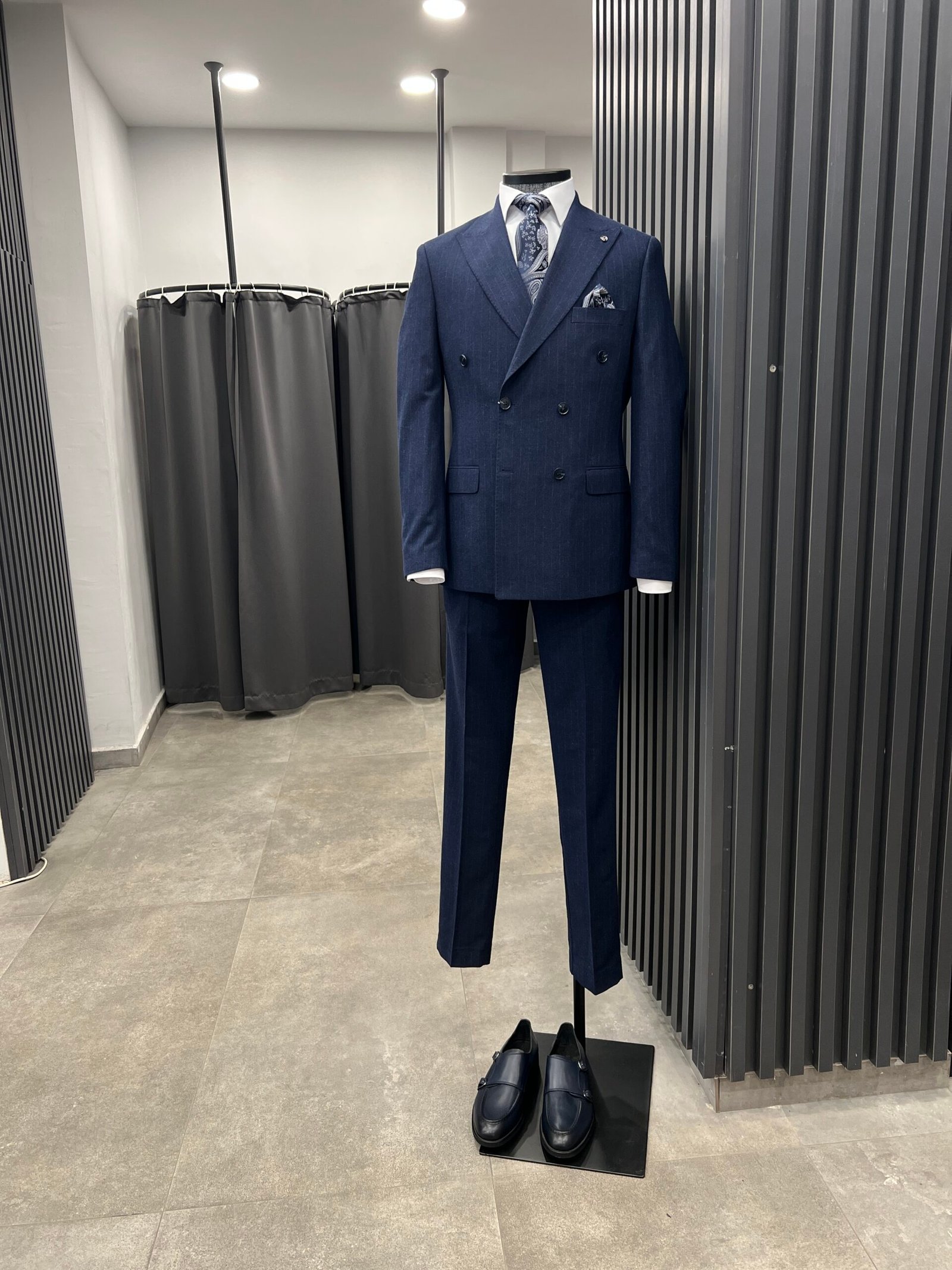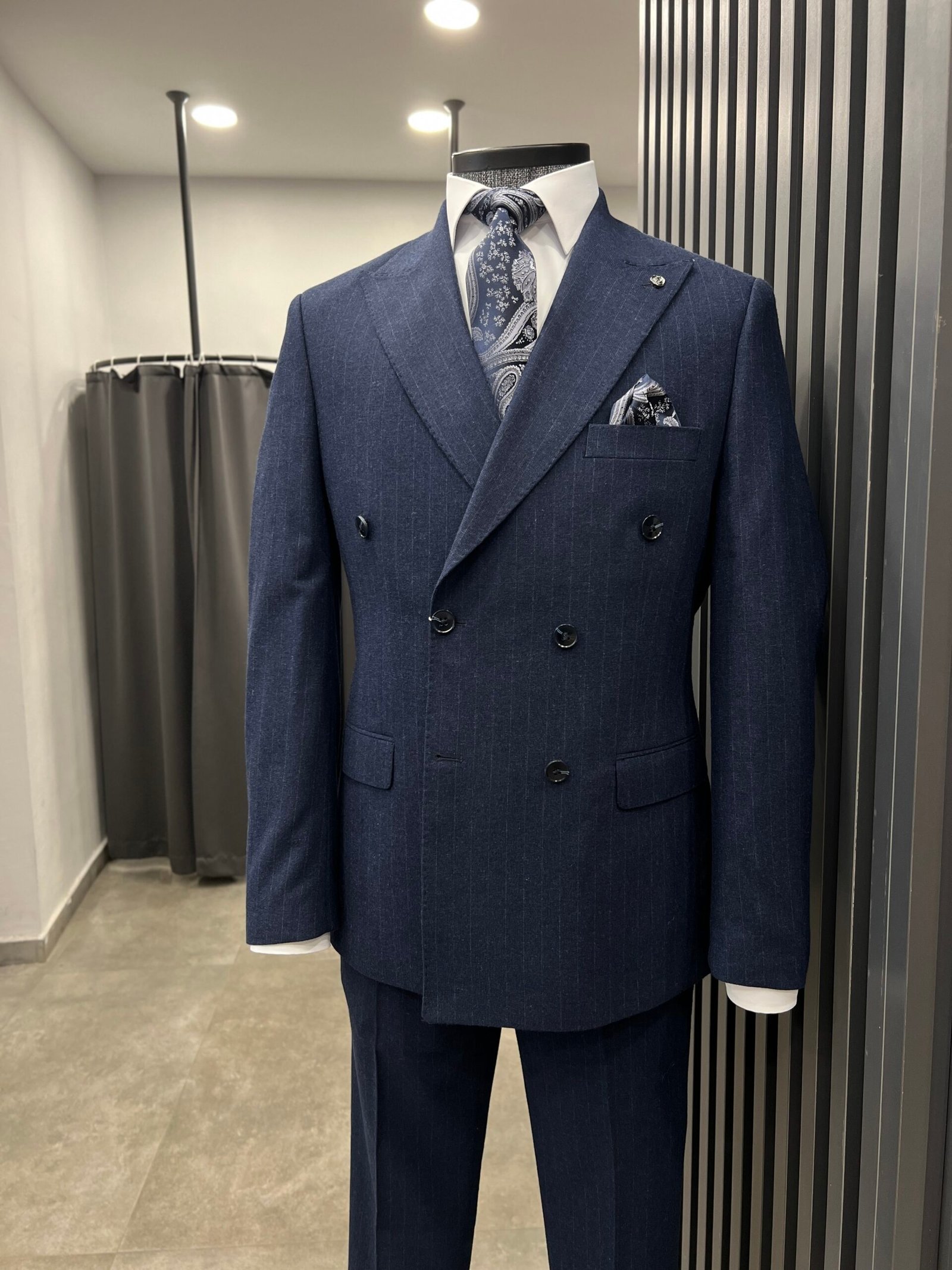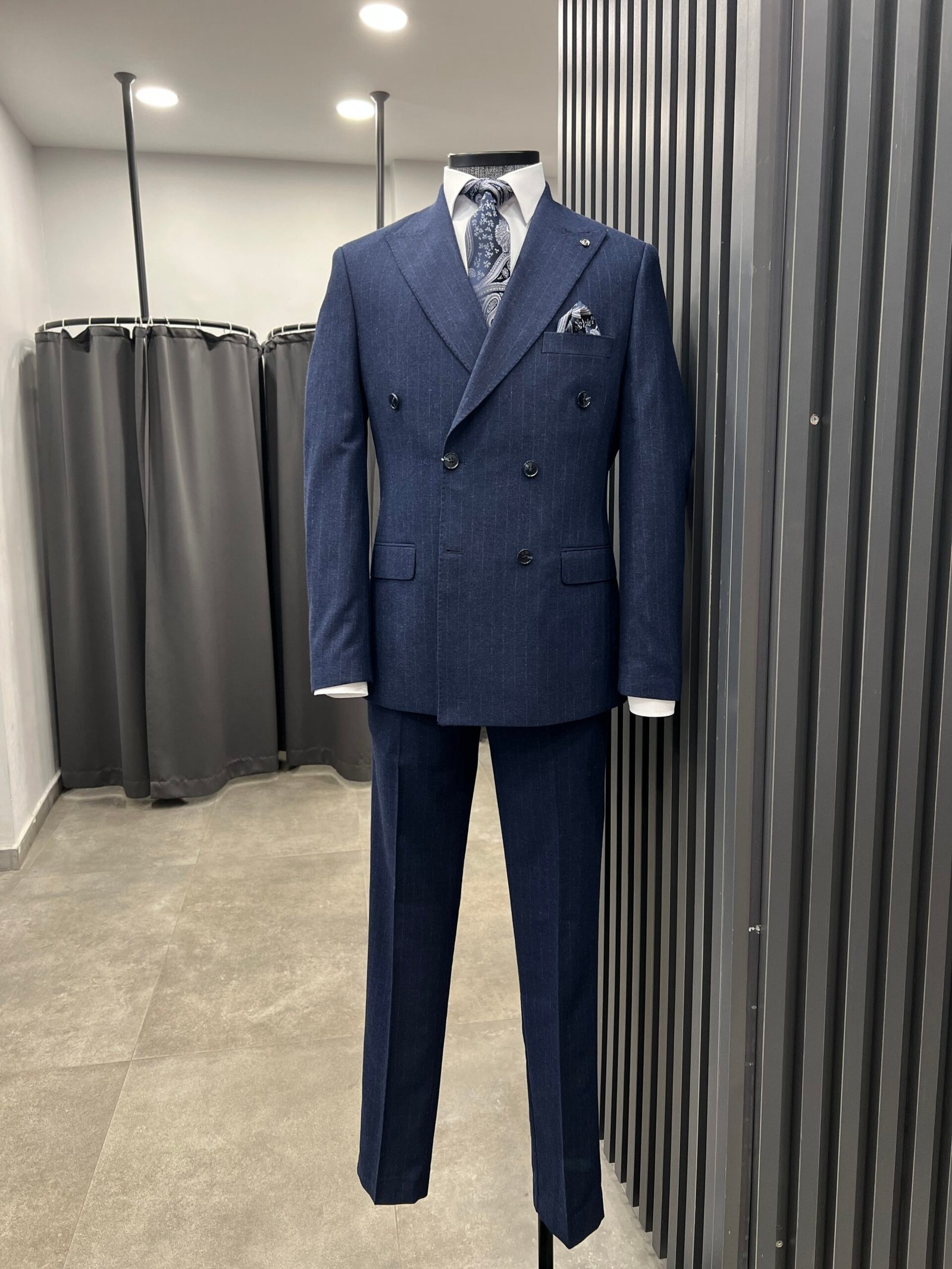 Flanel açık lacivert kruvaze takım elbise, modelli pantolonu, yarım astar ceketi ve yün karışımlı kumaşı ile özel bir ürün.