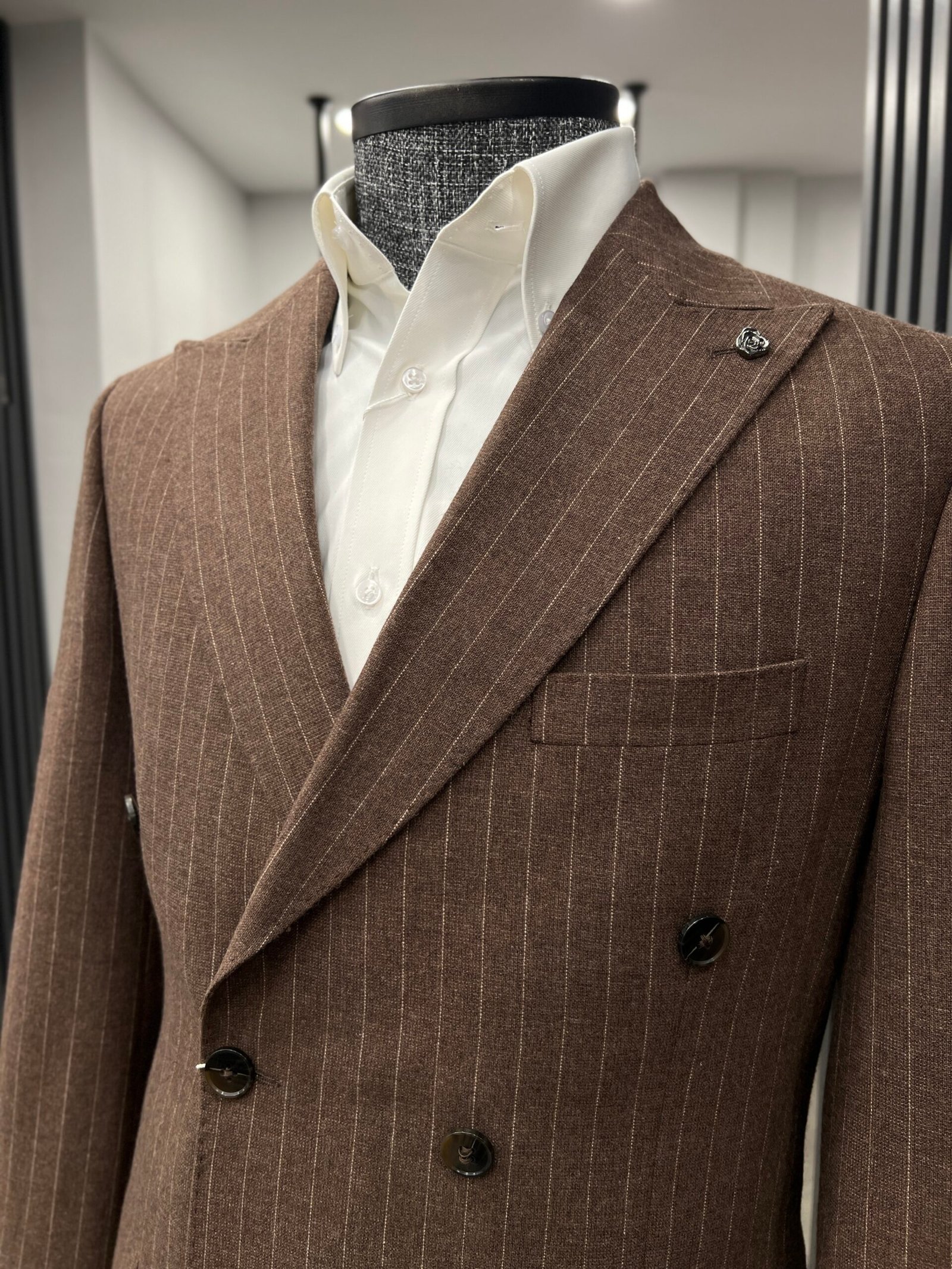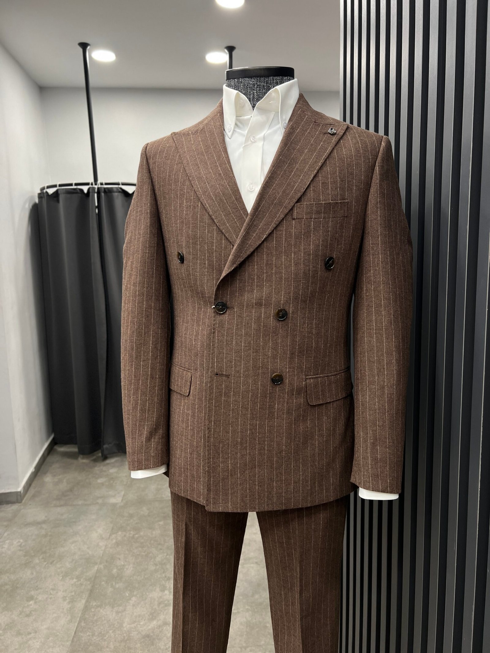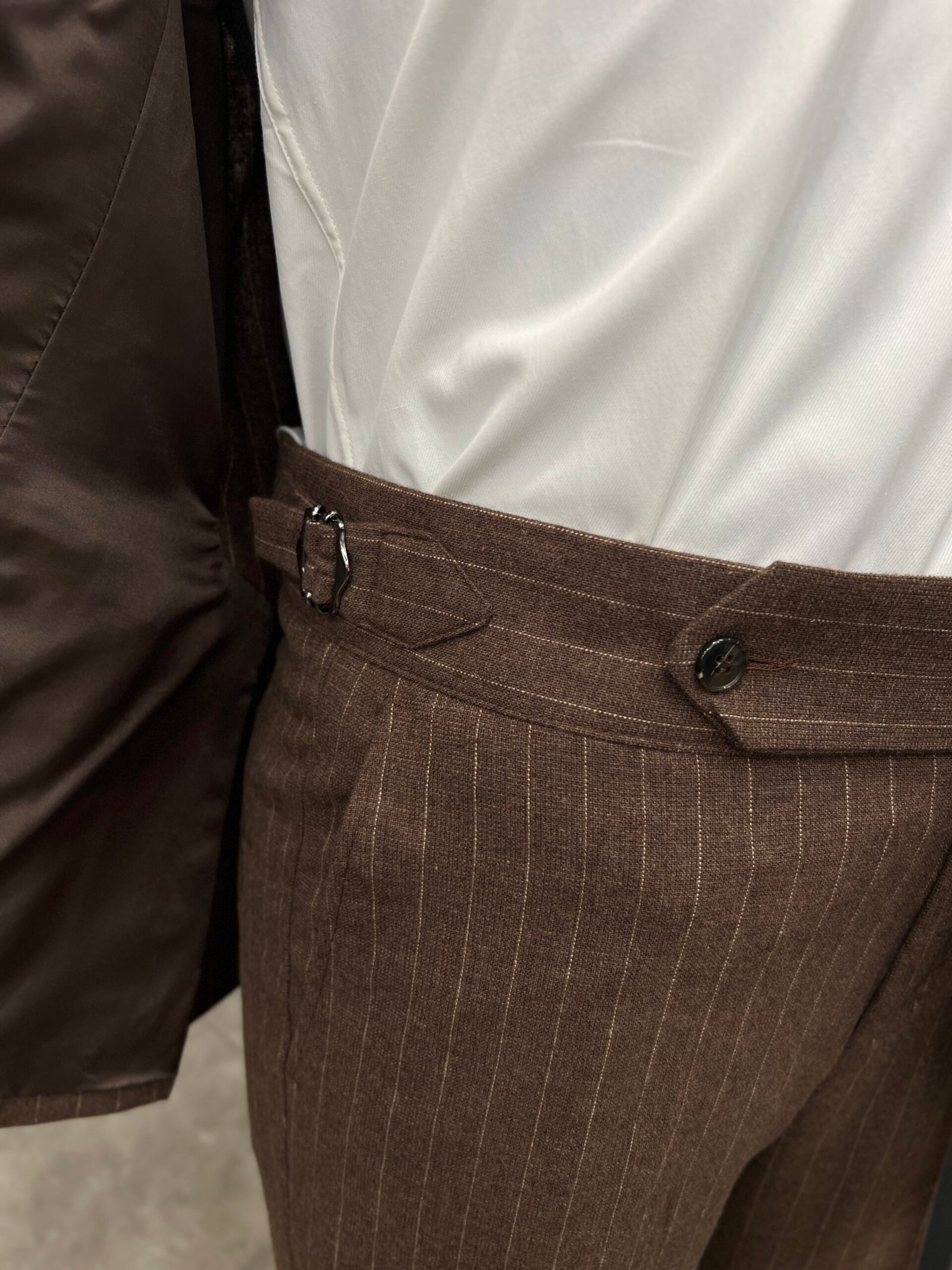 Kahve renk flanel kruvaze takım elbise; modelli pantolonu, yarım astar ceketi ve yün karışımlı kumaşı ile özel bir ürün.