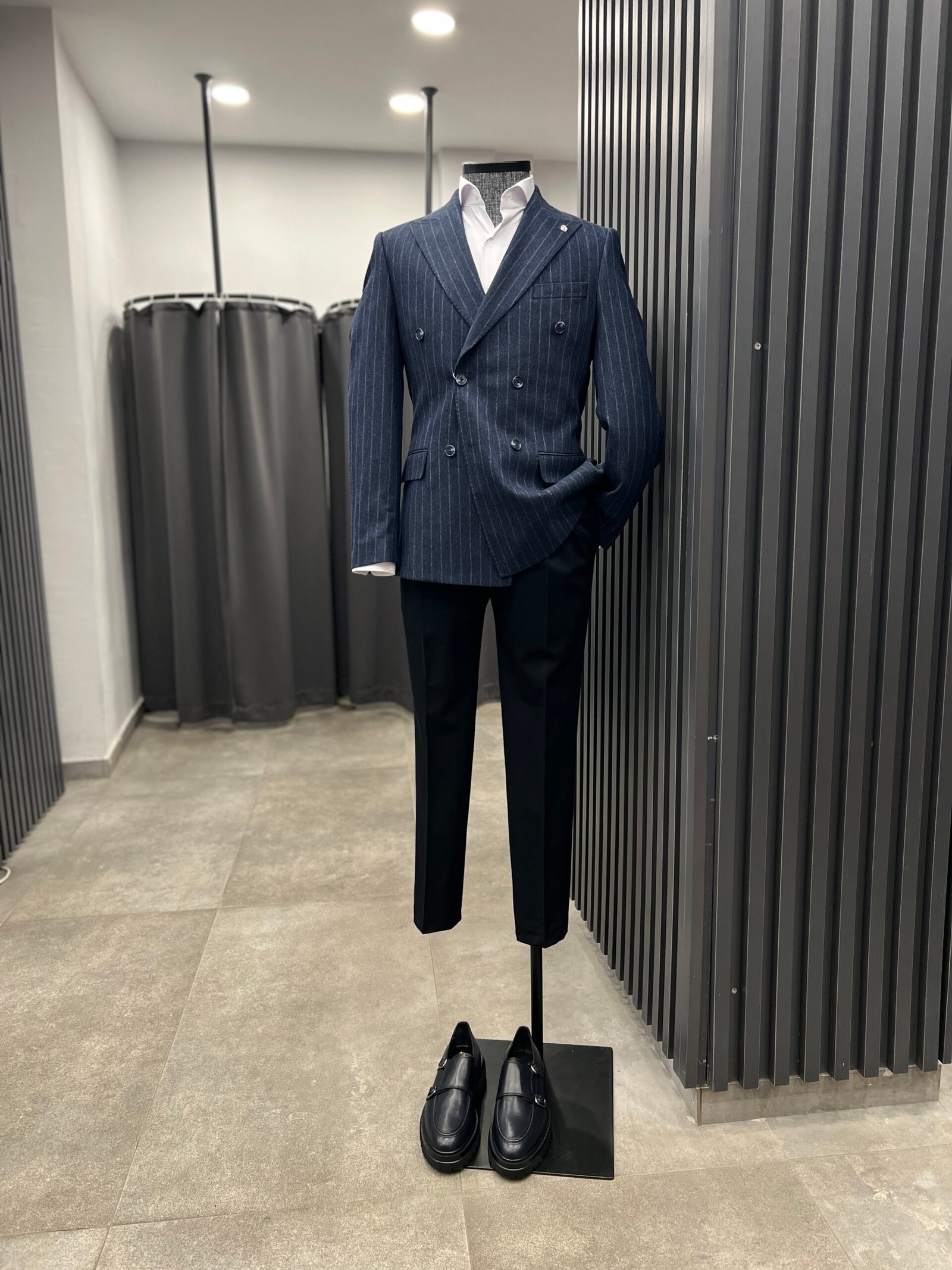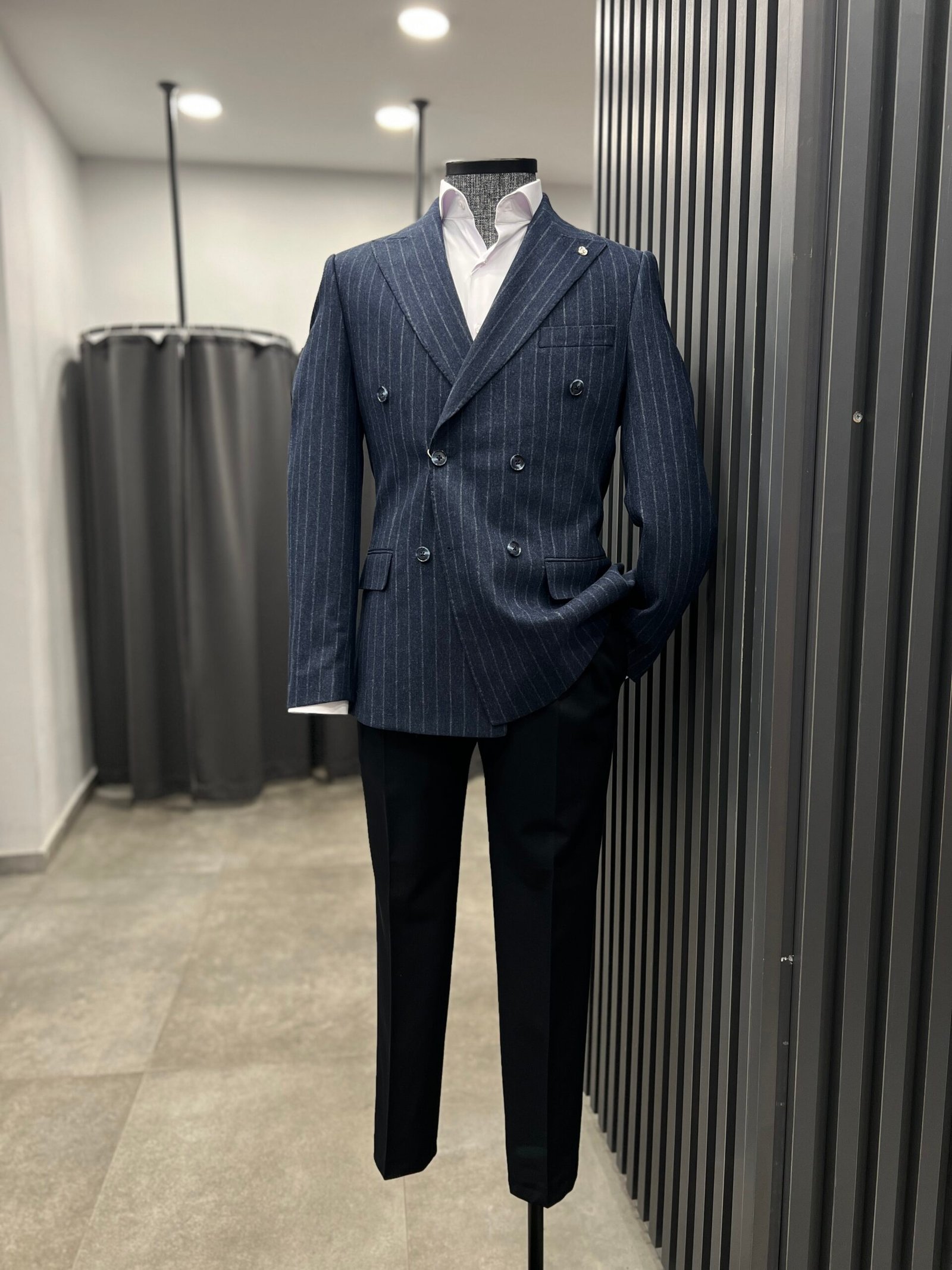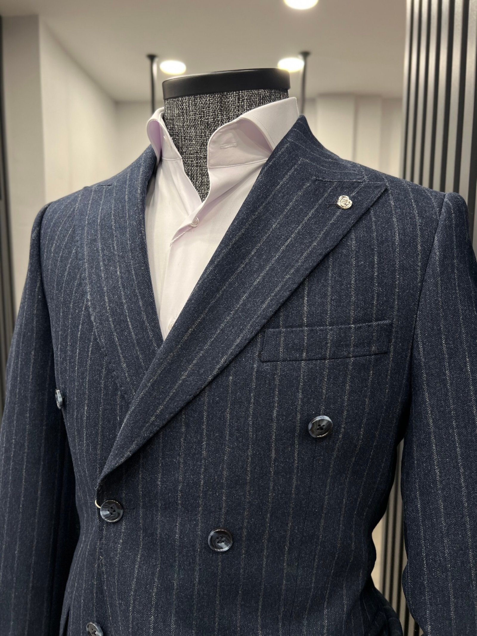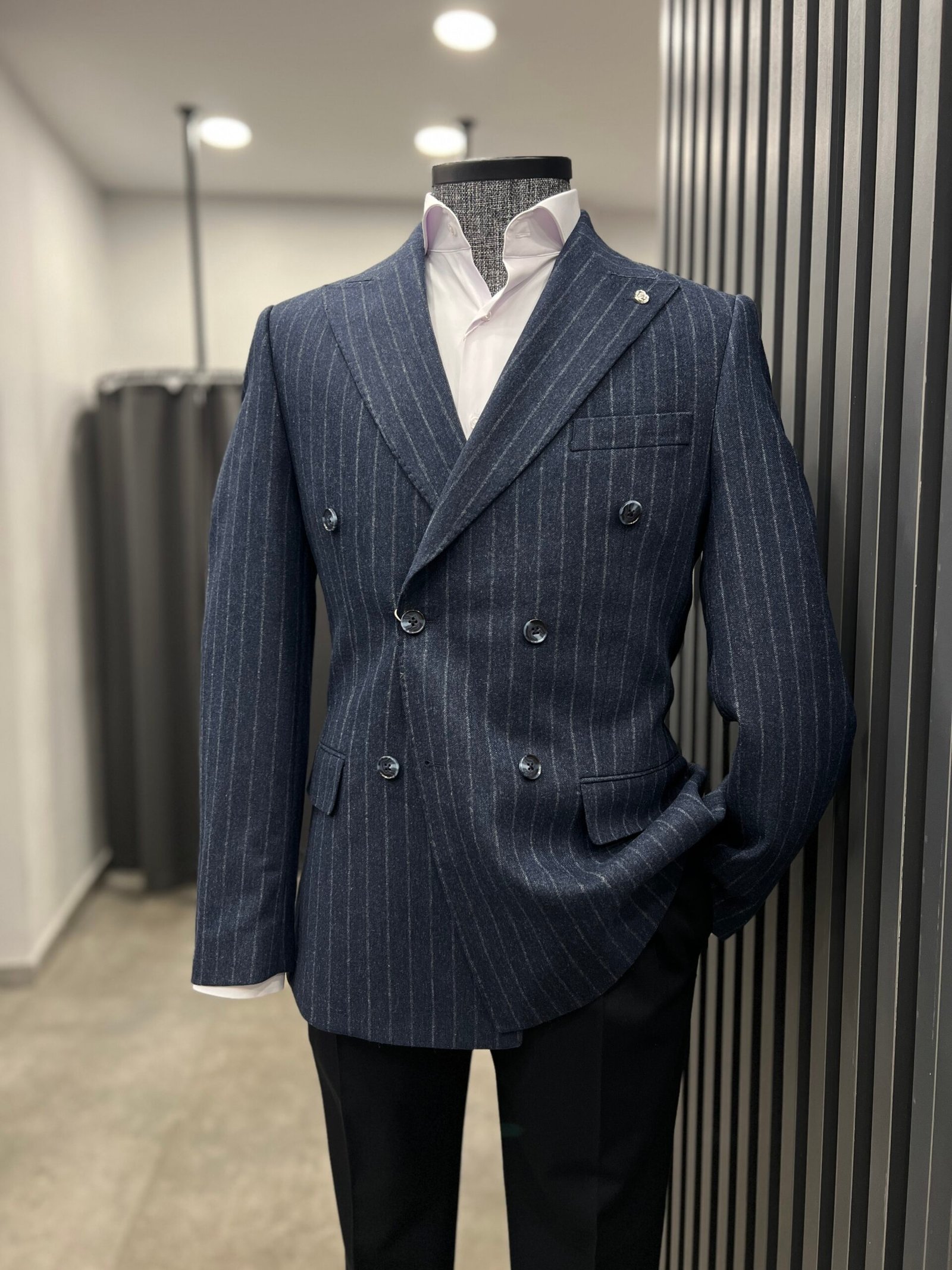 Lacivert kruvaze çizgili ceket ,yün karışımlı kumaşı şık kombinler yapmanıza olanak sağlıyor.