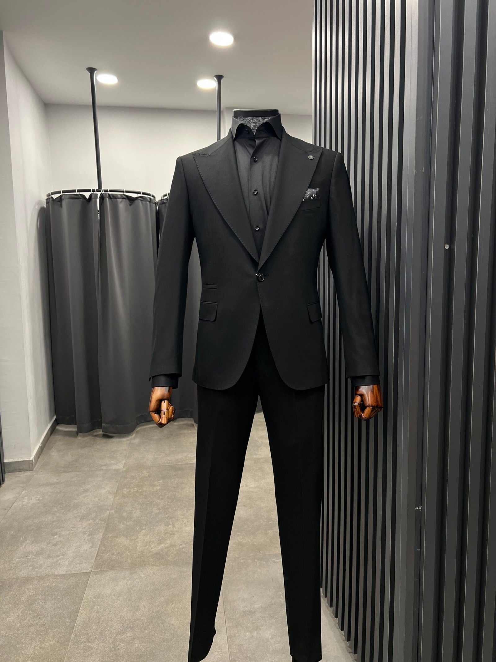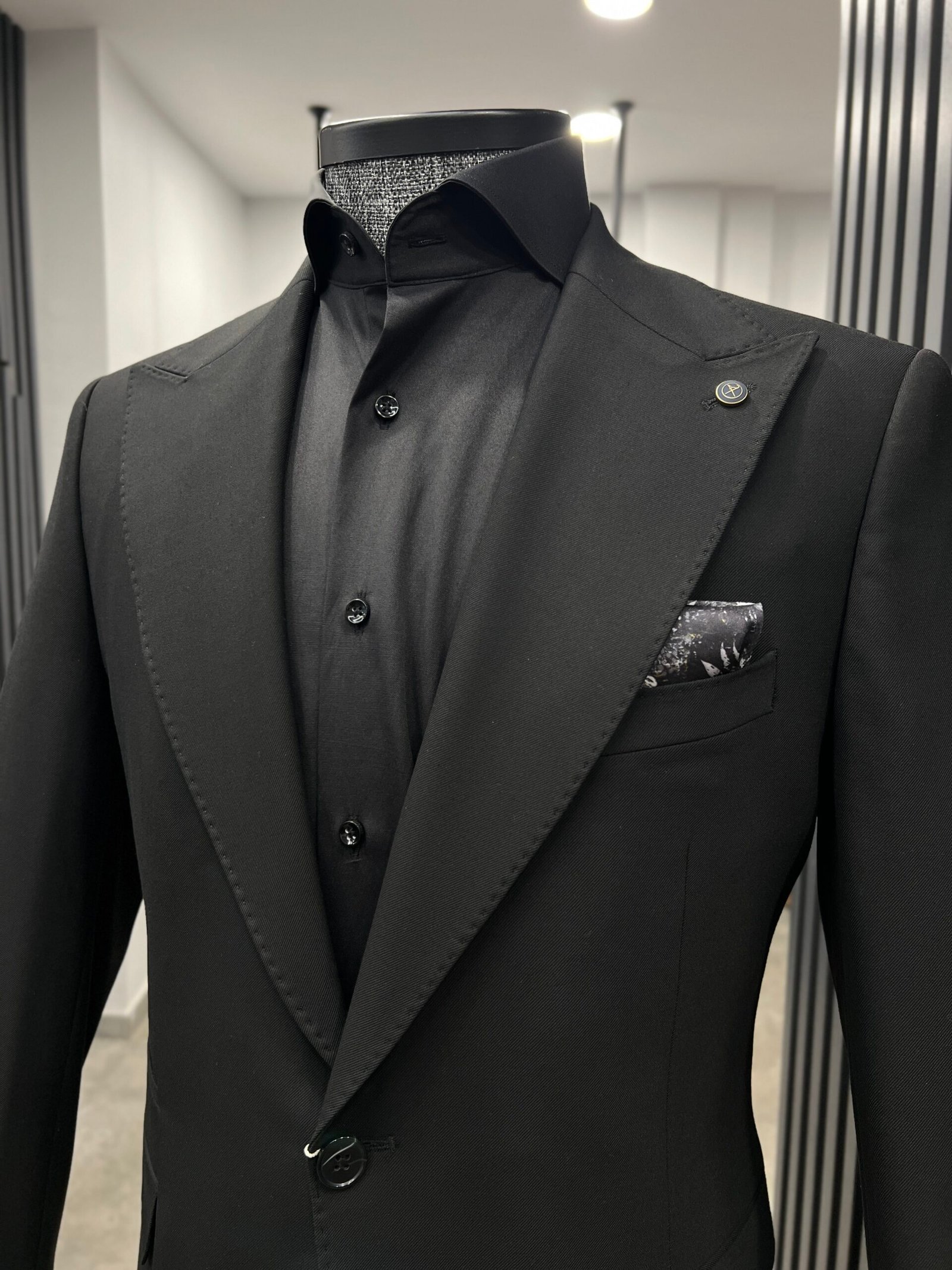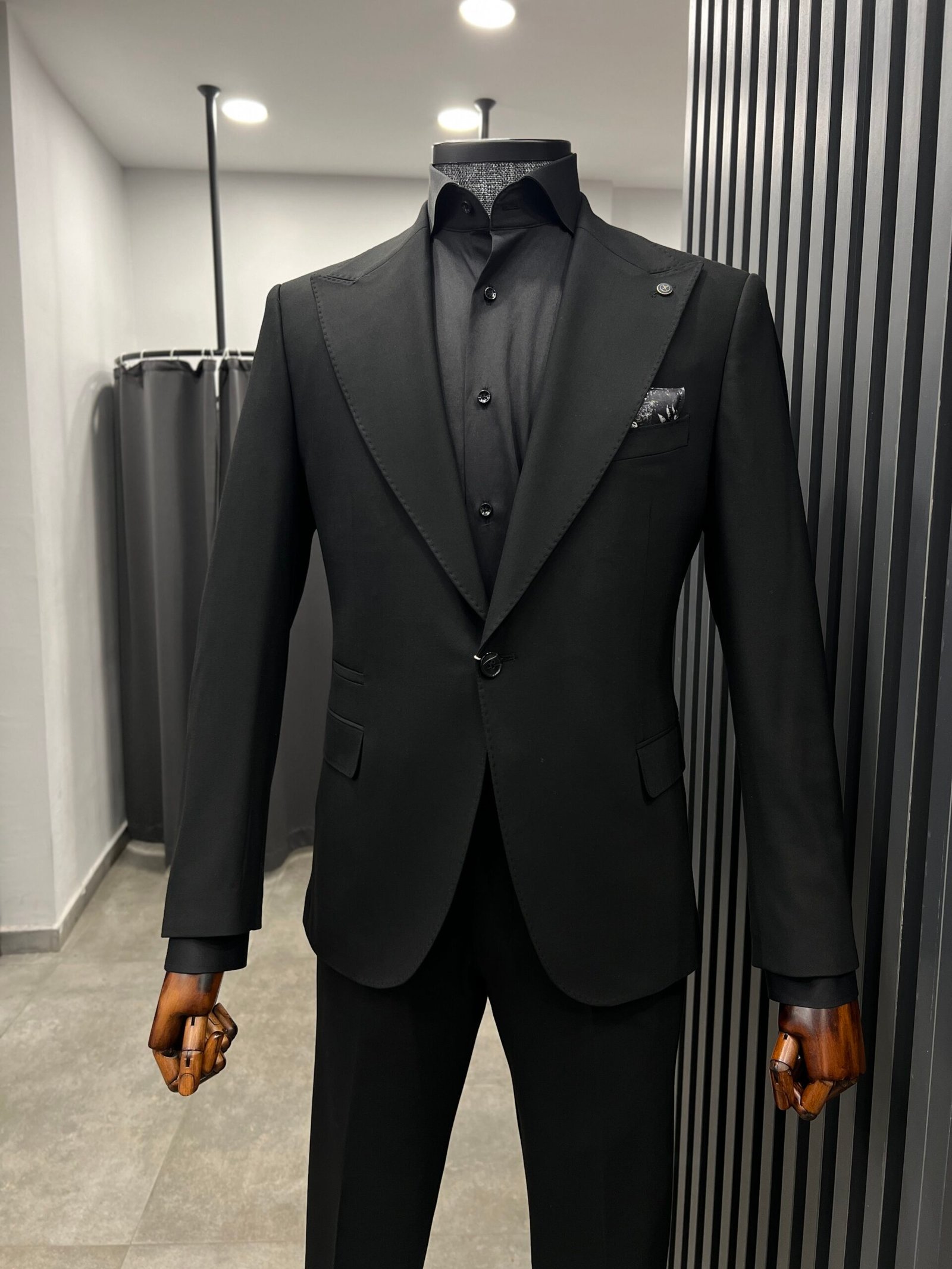 Siyah takım elbise, geniş kırlangıç yaka ve tek düğmeli modeli ile siyah takım elbisenin modern hali…
