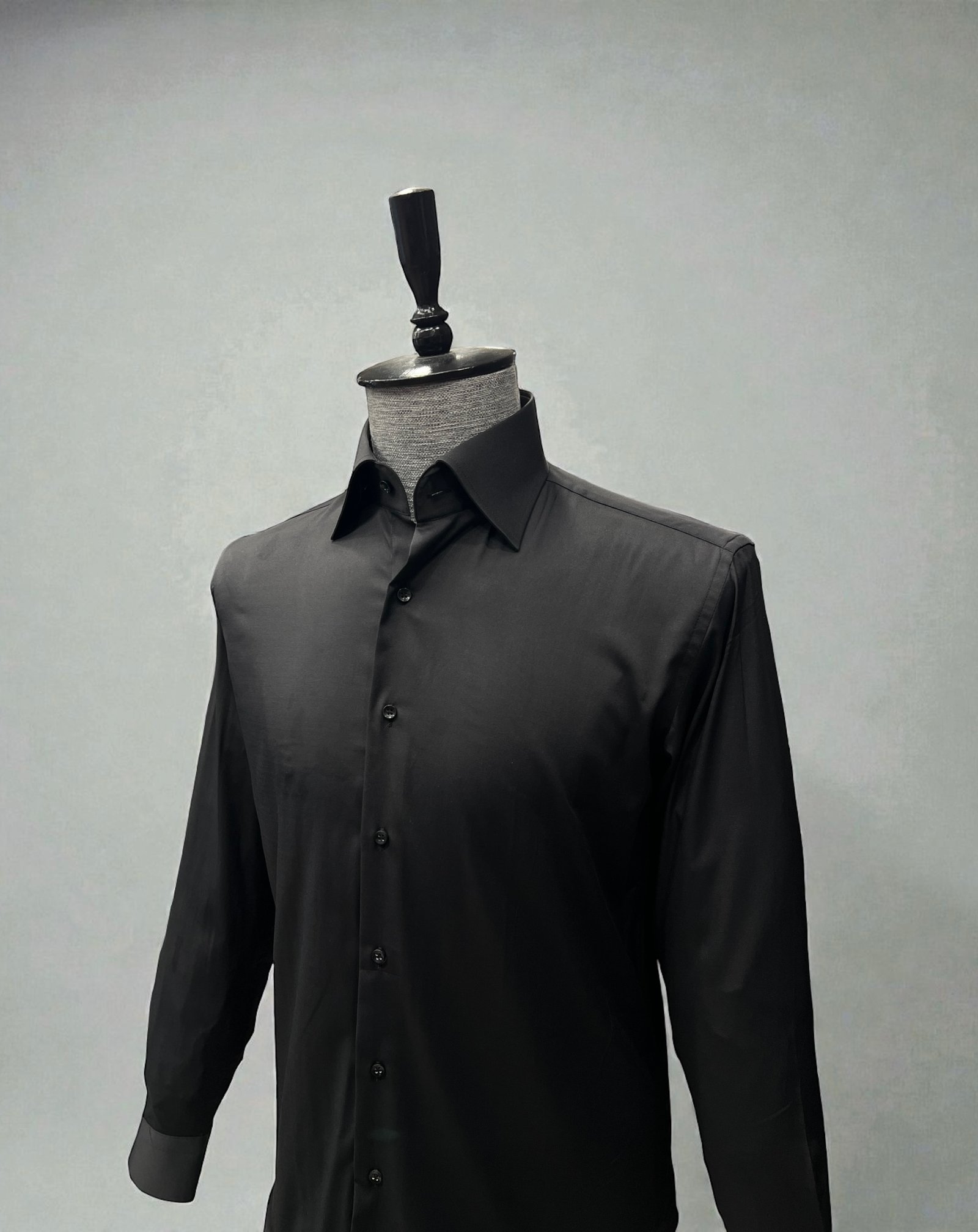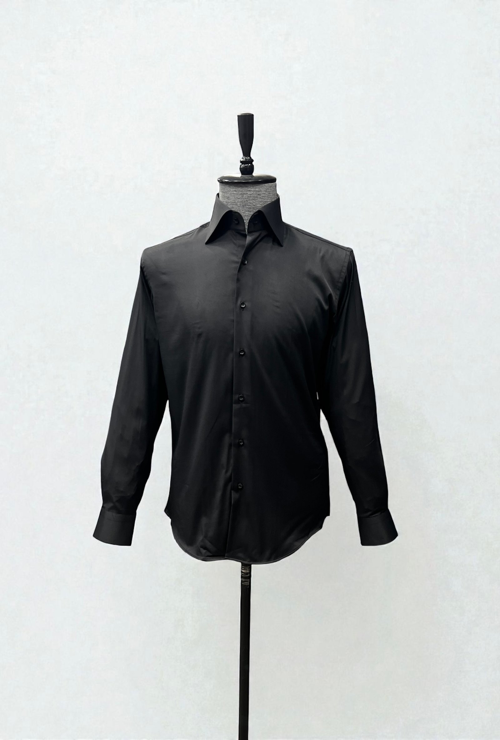 Siyah yüksek yaka, yaka gizli düğmeli gömlek ile kombinlerinizi tamamlayın.